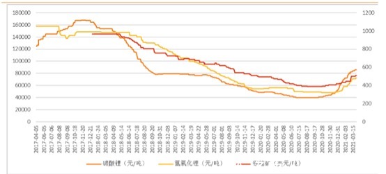 无独有偶,其实此前银河资源就有过15000吨的锂精矿以1000美元/吨以上的价格成交,说明了锂资源价格的强劲,而锂辉石作为碳酸锂和氢氧化锂等主要锂电池原材料,它的的涨价趋势毫无疑问将很大概率向锂盐传导,从此前碳酸锂、锂精矿和氢氧化锂的历史价格走势图来看,三者有着很强的价格走向趋势。目前电池级碳酸锂价格为8.85万元/吨,而电池级氢氧化锂价格已经突破10万元/吨,如果锂精矿持续涨价又没有新的供给进入市场,锂盐价格或还将继续涨价。